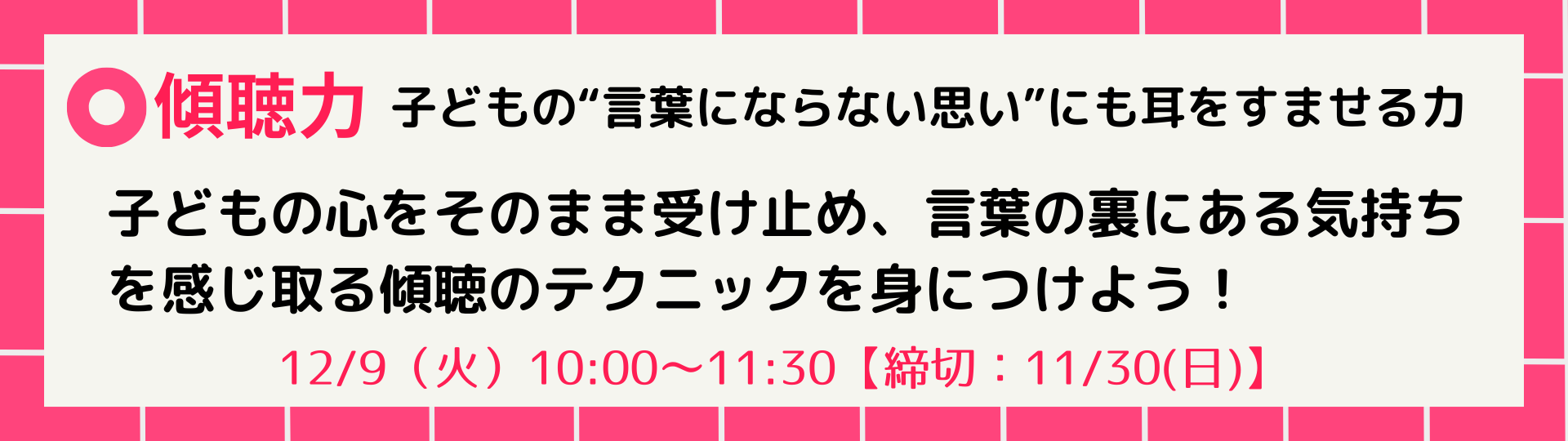 そこで、本セミナーでは、子どもに関わるすべての大人が「子どもに安心感を届ける関わり方=傾聴力」を基本から学ぶことができます。