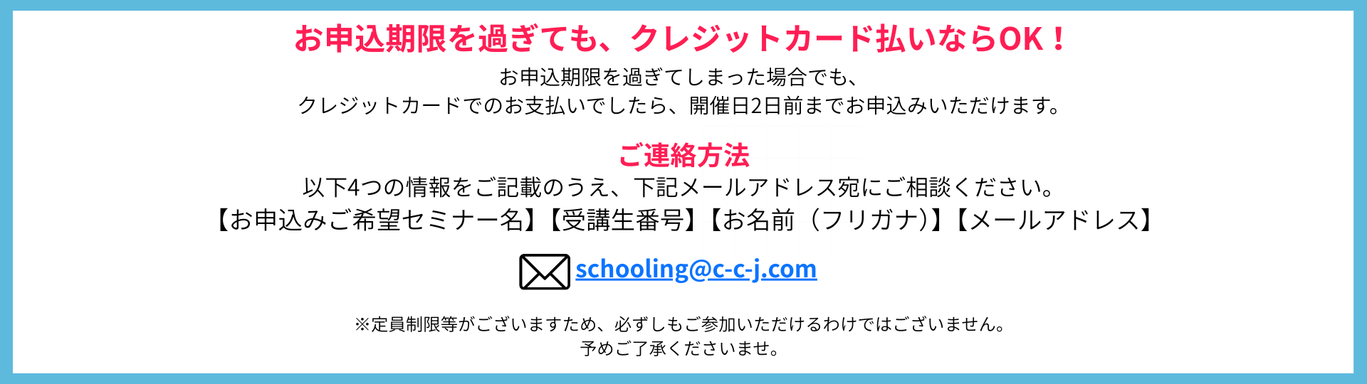 万が一、ご入金後1週間以上メールが届かない場合は、必ず開催2日前までに、スクーリング事務局(schooling@c-c-j.com)までメールにてご連絡ください。