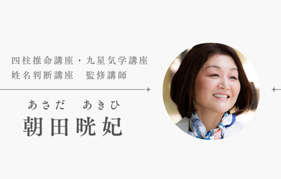 キャリカレ監修講師 朝田 晄妃先生 1969 年 8 月 16 日生まれ。占い師(吉方位×美顔をつくる開運デザイナー) ボーカリスト・ボイストレーナー(ヤマハPMSなど)として活躍。その後、占い師に転向、奇門遁甲/風水/四柱推命/断易など様々な占術を使いこなし、従来のお悩み相談ではなく開運できる占術に力を注いでいる。 資格のキャリカレの通信講座で四柱推命・九星気学・姓名判断の監修をし、後進の育成にも携わる。 |