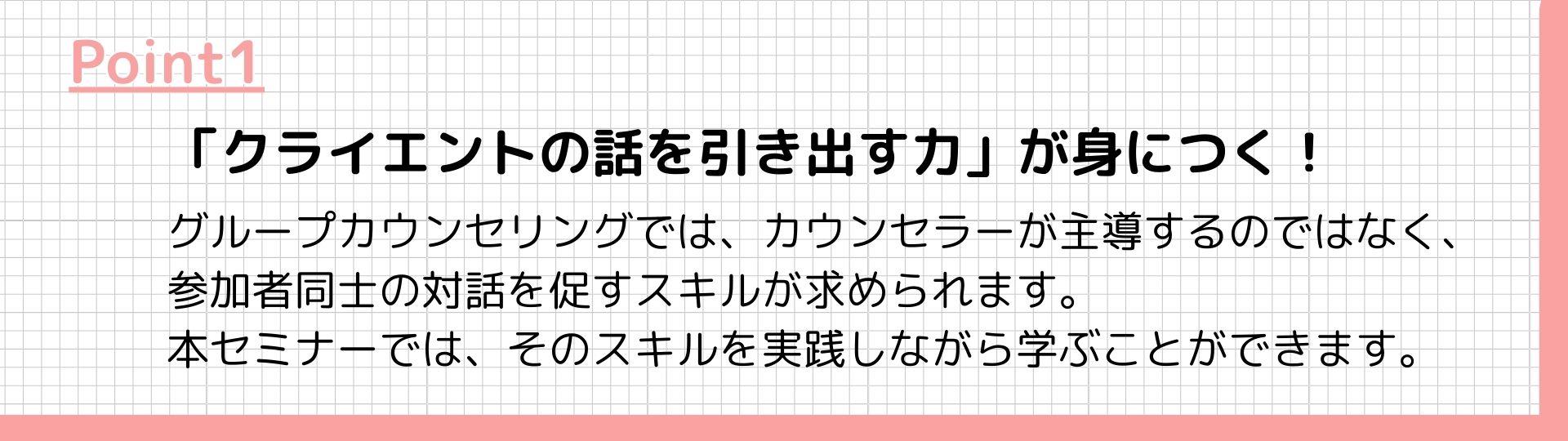 このセミナーでは、グループカウンセリングの基本から効果的な進行方法(ファシリテーション) まで、「知識+体験」を組み合わせて学ぶことができます。